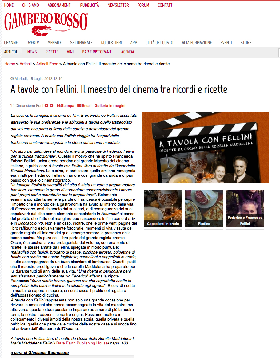 GAMBERO ROSSO MAGAZINE : “A TAVOLA CON FELLINI” – Intervista a Francesca FELLINI di Giuseppe Buonocore