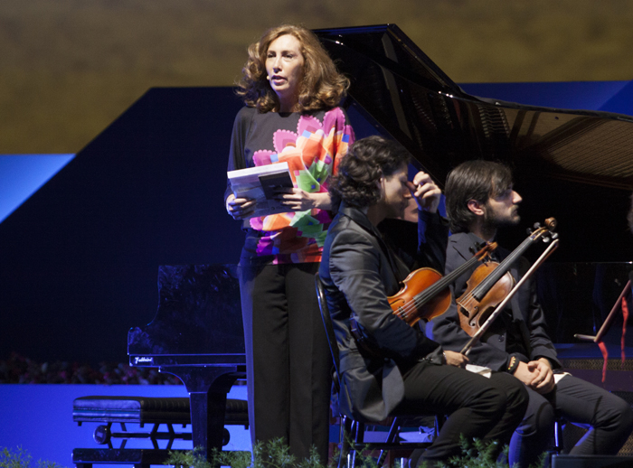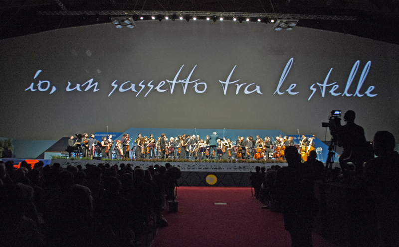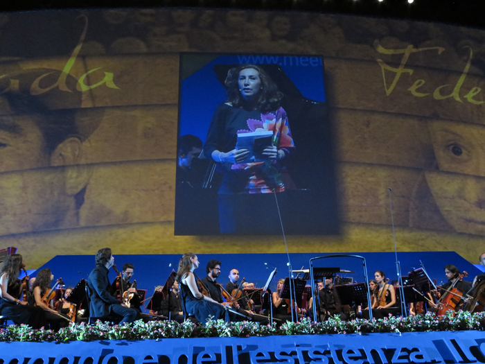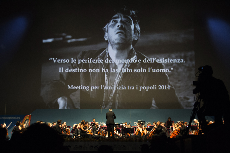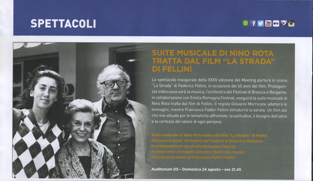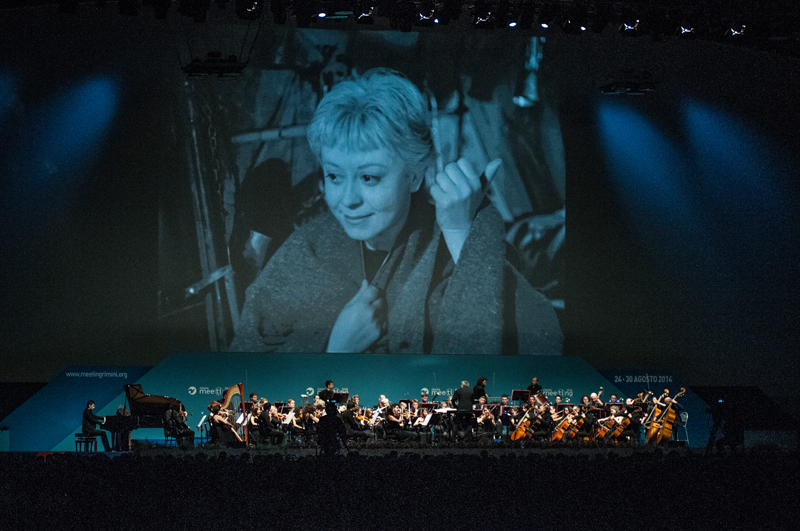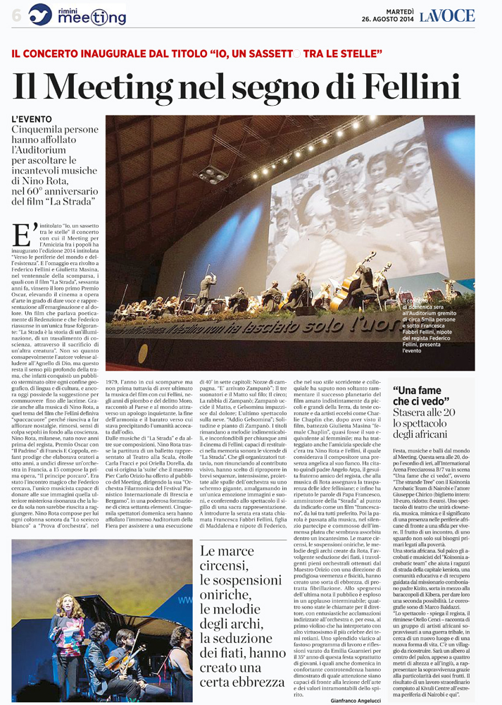 Francesca Fellini ha introdotto il Concerto “Io, un sassetto tra le stelle”, esecuzione della Suite di Nino Rota del Balletto  “La Strada” di Federico Fellini”, un omaggio a Federico Fellini, per inaugurare la XXXV edizione del Meeting dell’Amicizia tra i Popoli, domenica 24 agosto 2014.