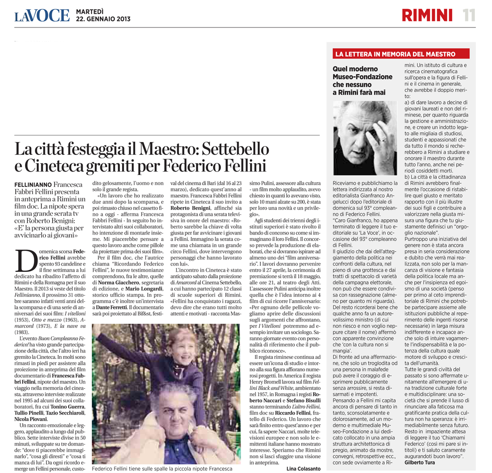 LA VOCE di RIMINI – 22-1-2013 Di admin|2013-01-24T13:01:39+01:00Gennaio 24th, 2013|News|0 Commenti Condividi questa storia, scegli tu dove! FacebookTwitterRedditLinkedInTumblrPinterestVkEmail Scritto da: admin Post correlati ВЕНТИЛЯЦИЯ ФЕЛЛИНИ В МИРЕ – Il CENTENARIO di FELLINI nel MONDO – The CENTENARY of FELLINI in the WORLD ВЕНТИЛЯЦИЯ ФЕЛЛИНИ В МИРЕ – Il CENTENARIO di FELLINI nel MONDO – The CENTENARY of FELLINI in the WORLD E’ scomparsa Magali Noel,la Gradisca di Fellini E’ scomparsa Magali Noel,la Gradisca di Fellini Archdirector by Federico Babina Archdirector by Federico Babina Fellini e la Moda Fellini e la Moda “The Nights of Cabiria” winning the Oscar® for Foreign Language Film “The Nights of Cabiria” winning the Oscar® for Foreign Language Film Scrivi un commento Annulla rispostaCommento Salva il mio nome, email e sito web in questo browser per la prossima volta che commento. Time limit is exhausted. Please reload the CAPTCHA. − 6 = zero Δ Questo sito usa Akismet per ridurre lo spam. Scopri come i tuoi dati vengono elaborati.