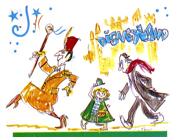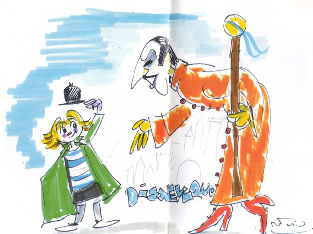….Nel 1987 chiesi a Fellini se aveva voglia di fare una lunga intervista su Walt Disney. L’occasione era data dal cinquantesimo anniversario dell’uscita di Biancaneve e i sette nani. Ci pensò qualche giorno e poi mi disse che potevamo provarci. Provare per lui significava buttare giù una traccia di racconto e dopo sceneggiarlo. Lavorammo dieci giorni prima di cominciare a girare. Non tralasciò alcun particolare, a partire dalle domande, che dovevano essere funzionali al racconto. Niente fu lasciato all’improvvisazione. Studiò tutto nei minimi dettagli, comprese le scene che avrebbe citato nell’intervista. Decise anche il titolo che non doveva suonare solenne e nemmeno spiritoso, ma normale: Walt Disney: Due chiacchiere con Federico Fellini. Scelse il luna-park dell’Eur come luogo dell’incontro, diede disposizioni ai due operatori e poi tutto cominciò come aveva previsto: io dovevo far finta di vederlo per caso, grazie alla complicità di Fiammetta Profili e di una fotografa con cui stava lavorando all’introduzione di un libro americano sui Clowns. Sempre per caso lui avrebbe risposto alle domande su Biancaneve e Disney, come se si trattasse di un’intervista scippata. Il gioco funzionò a tal punto che quando andò in onda il programma come Speciale TG1, nessuno si accorse, compresi i critici televisivi, che tutto era stato studiato nel dettaglio. Il presidente della Disney italiana di allora, Bertini, per l’ammirazione che aveva per Fellini, tramite Vito Matassino ci mise a disposizione tutto l’archivio cinematografico, compresi i dodici film considerati intoccabili, televisivamente parlando, tra cui Biancaneve e i sette nani. Per illustrare il suo incontro con Disney Fellini fece anche un disegno molto buffo e festoso…
